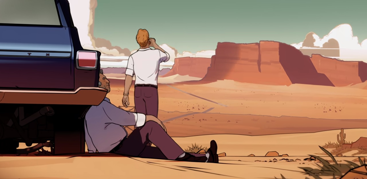 배경은 넓은 사막입니다. 두 사람은 외판원으로 넓은 사막 도로를 달리던 중 차가 고장나면서 시작됩니다.