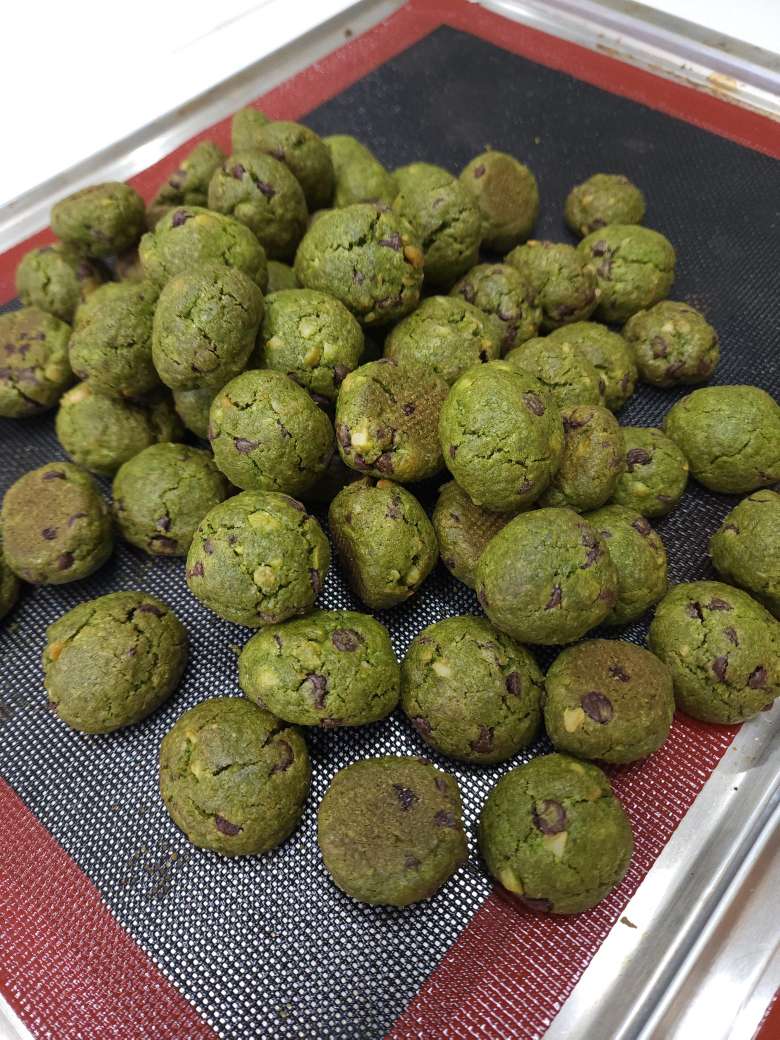말차 초코 쿠키에는 초코랑 마카다미아도 넣었습니다.초코 쿠키랑 초코칩 쿠키, 말차 초코 쿠키는 휴지를 끝낸 반죽을 적당 크키로 잘라서손으로 동글동글 모양을 내줬어요.